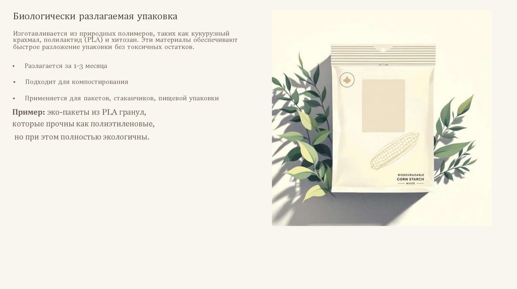 Биологически разлагаемая упаковкаИзготавливается из природных полимеров, таких как кукурузный