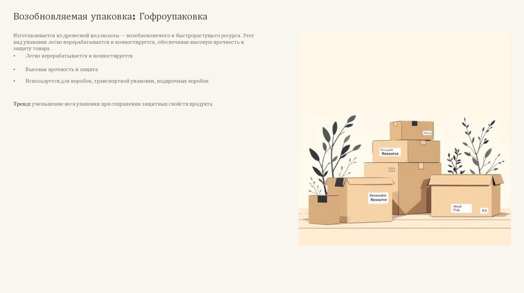 Возобновляемая упаковка: ГофроупаковкаИзготавливается из древесной целлюлозы — возобновляемого и быстрорастущего ресурса. Этот