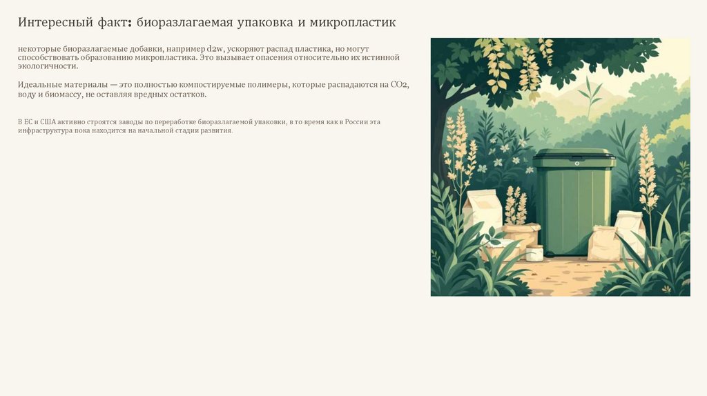 Интересный факт: биоразлагаемая упаковка и микропластикнекоторые биоразлагаемые добавки, например d2w, ускоряют распад пластика, но могут