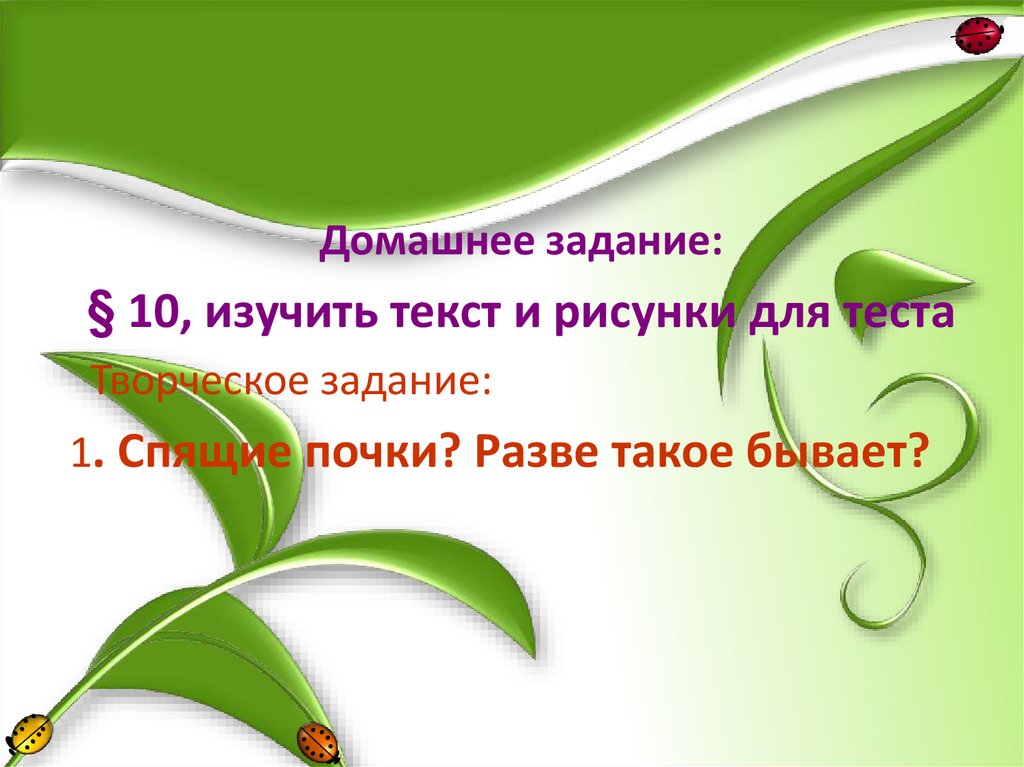 Домашнее задание:§ 10, изучить текст и рисунки для теста