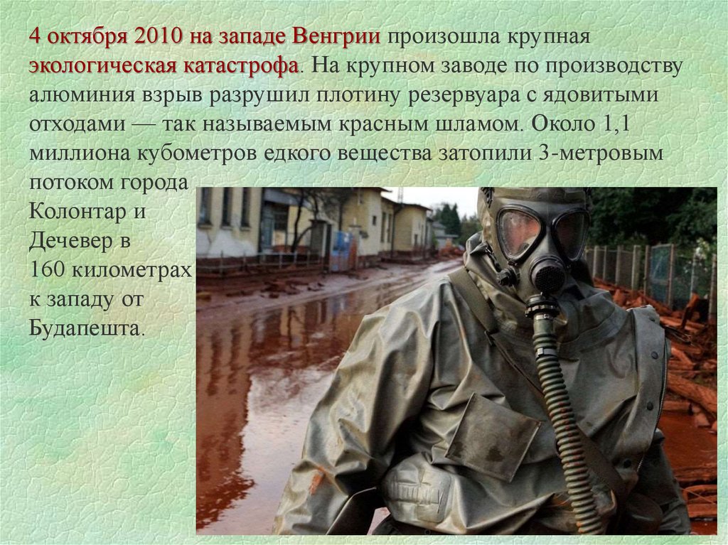 4 октября 2010 на западе Венгрии произошла крупнаяэкологическая катастрофа. На крупном заводе по производству
