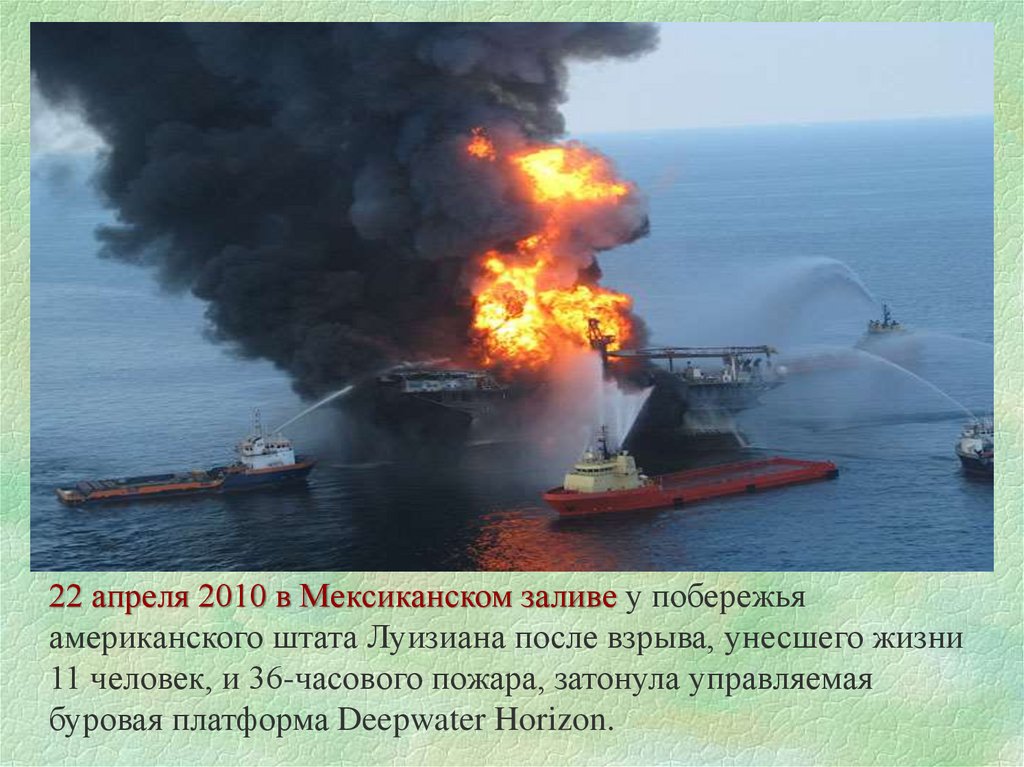 22 апреля 2010 в Мексиканском заливе у побережьяамериканского штата Луизиана после взрыва, унесшего жизни