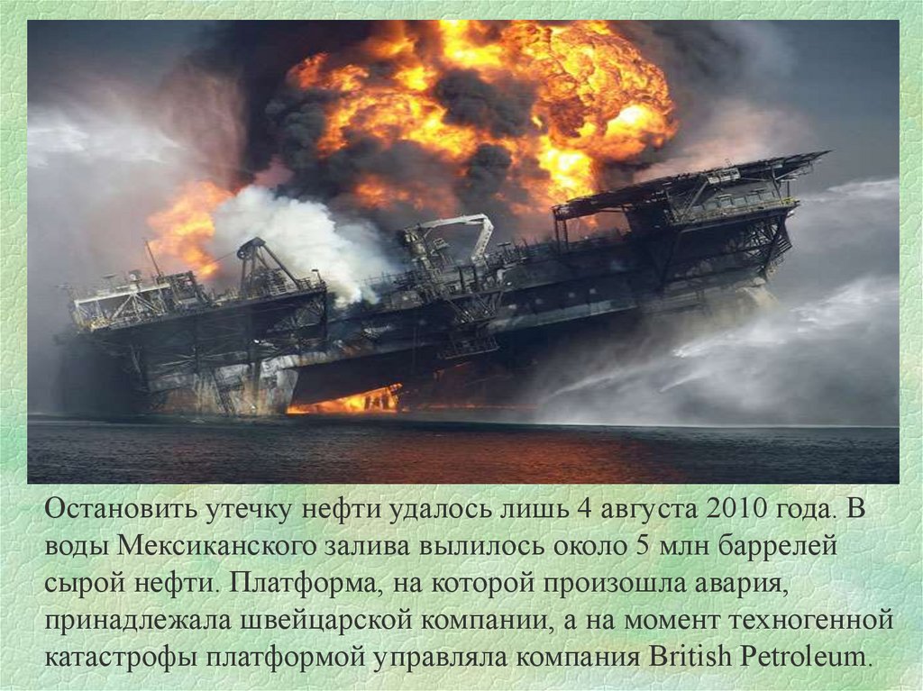 Остановить утечку нефти удалось лишь 4 августа 2010 года. Вводы Мексиканского залива вылилось около 5 млн баррелей