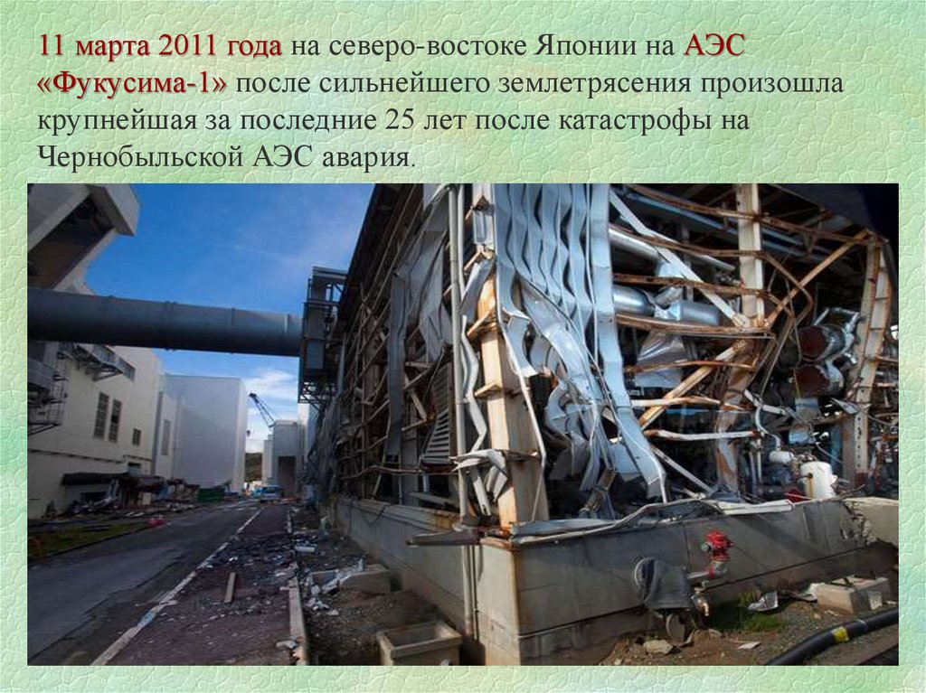 11 марта 2011 года на северо-востоке Японии на АЭС«Фукусима-1» после сильнейшего землетрясения произошла