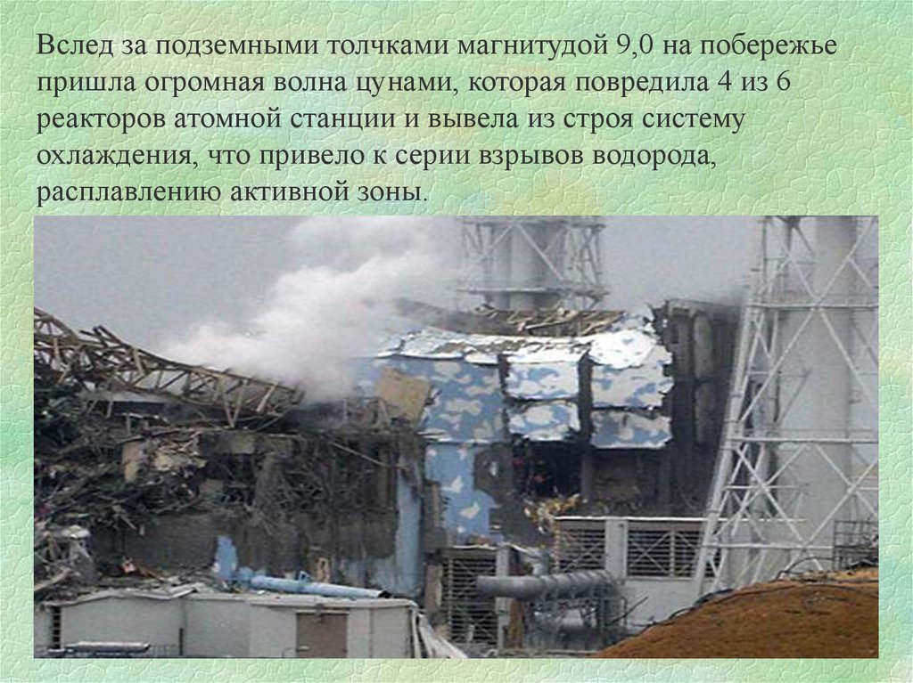 Вслед за подземными толчками магнитудой 9,0 на побережьепришла огромная волна цунами, которая повредила 4 из 6