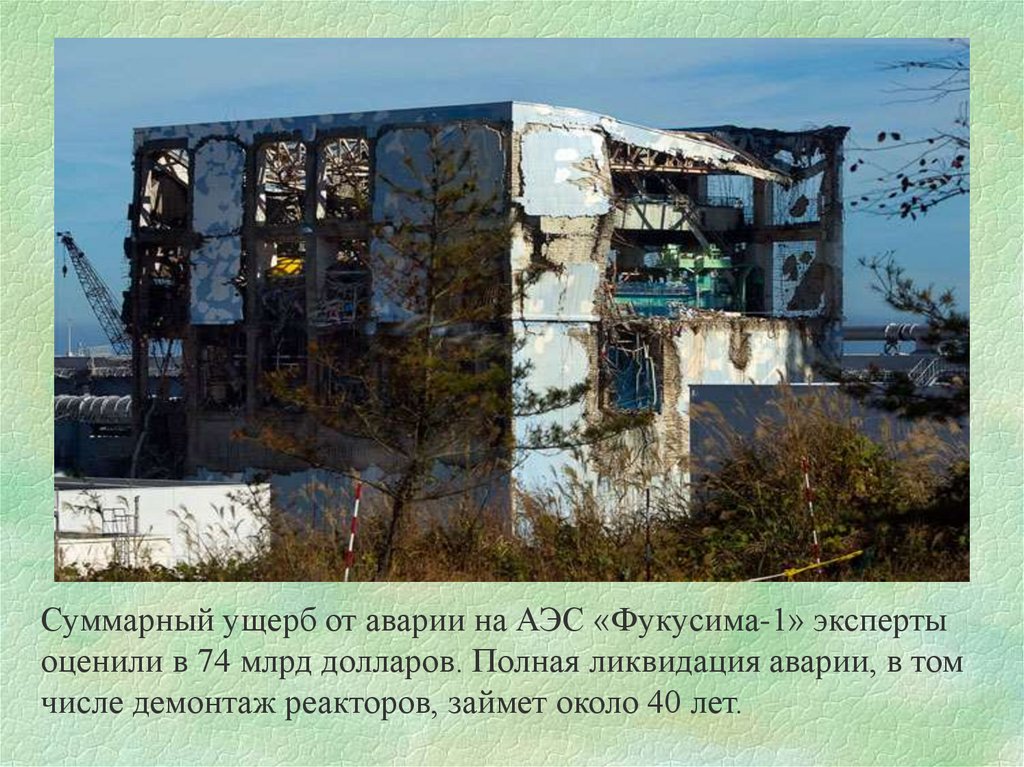 Суммарный ущерб от аварии на АЭС «Фукусима-1» экспертыоценили в 74 млрд долларов. Полная ликвидация аварии, в том