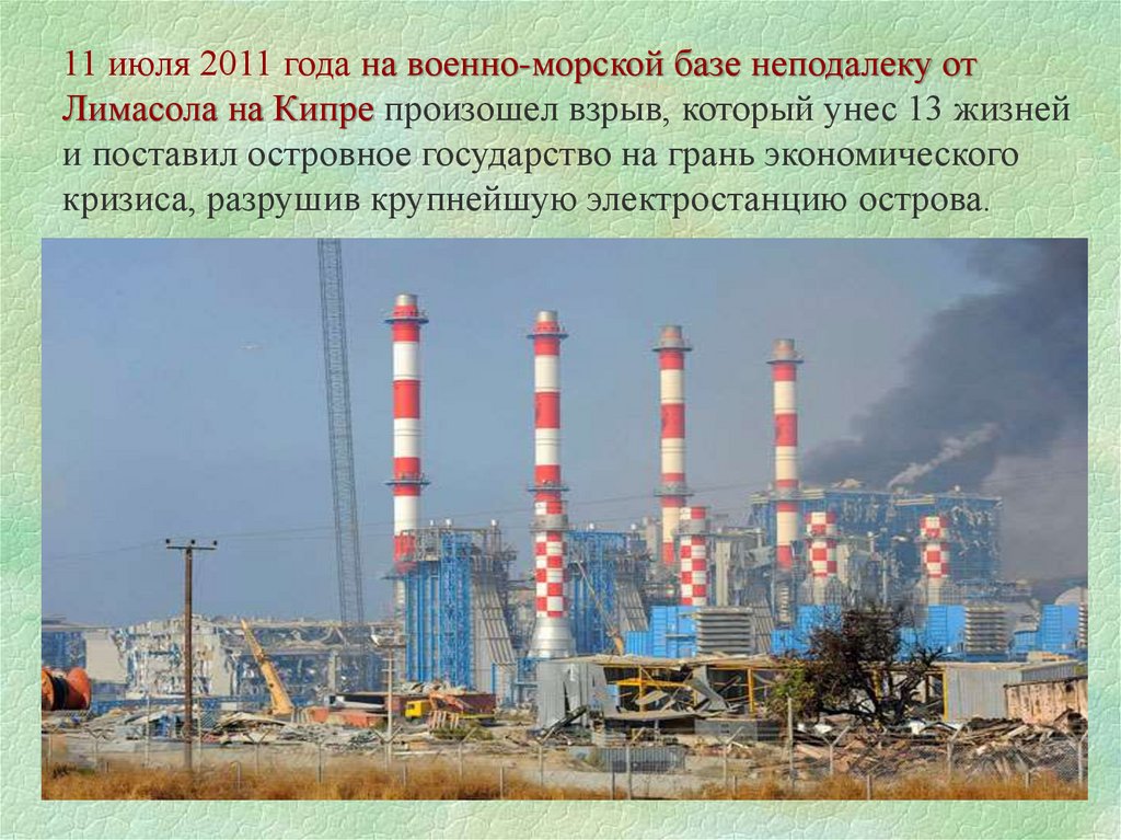 11 июля 2011 года на военно-морской базе неподалеку отЛимасола на Кипре произошел взрыв, который унес 13 жизней