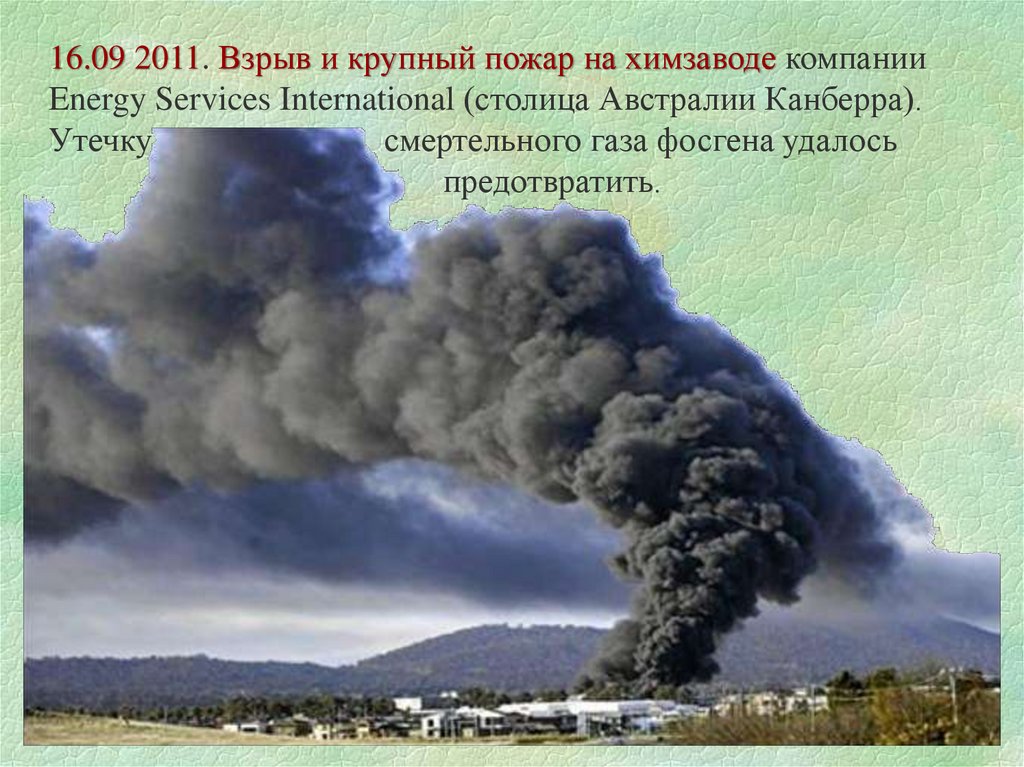 16.09 2011. Взрыв и крупный пожар на химзаводе компанииEnergy Services International (столица Австралии Канберра).