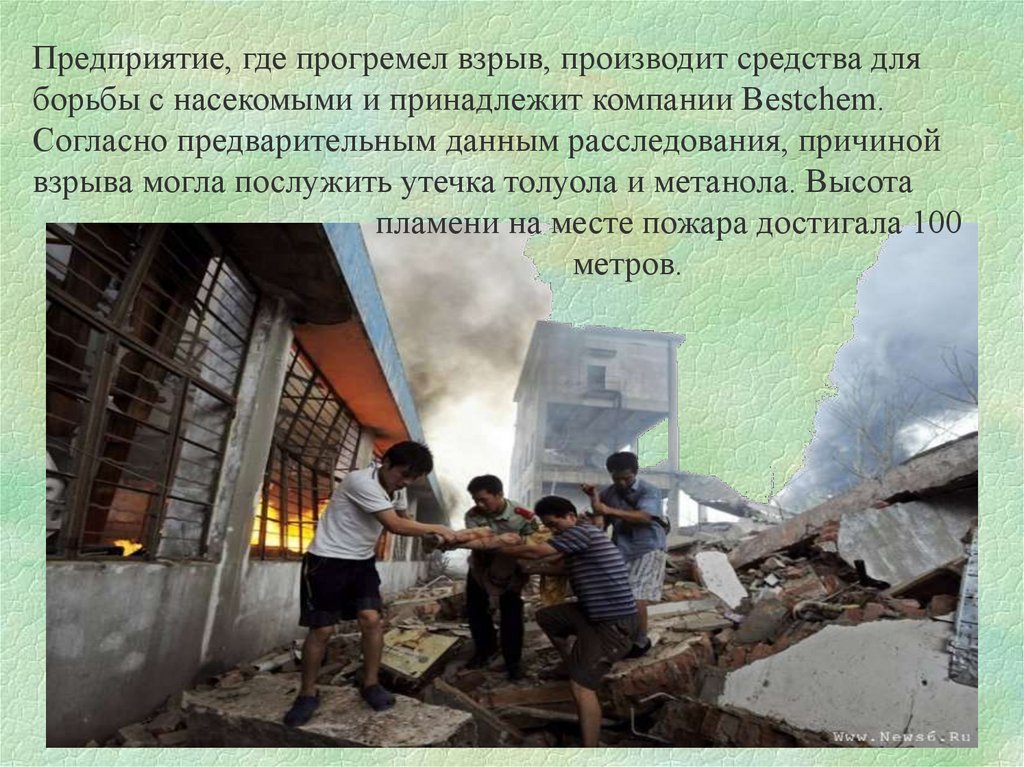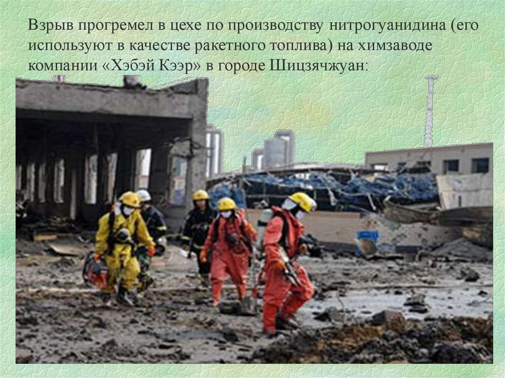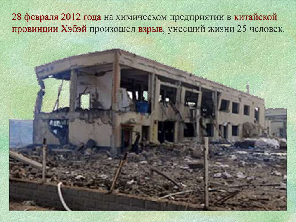 28 февраля 2012 года на химическом предприятии в китайскойпровинции Хэбэй произошел взрыв, унесший жизни 25 человек.
