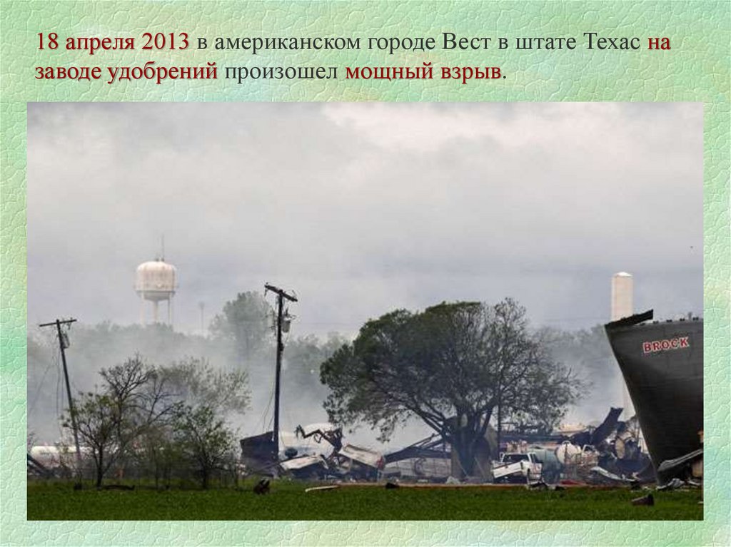 18 апреля 2013 в американском городе Вест в штате Техас назаводе удобрений произошел мощный взрыв.