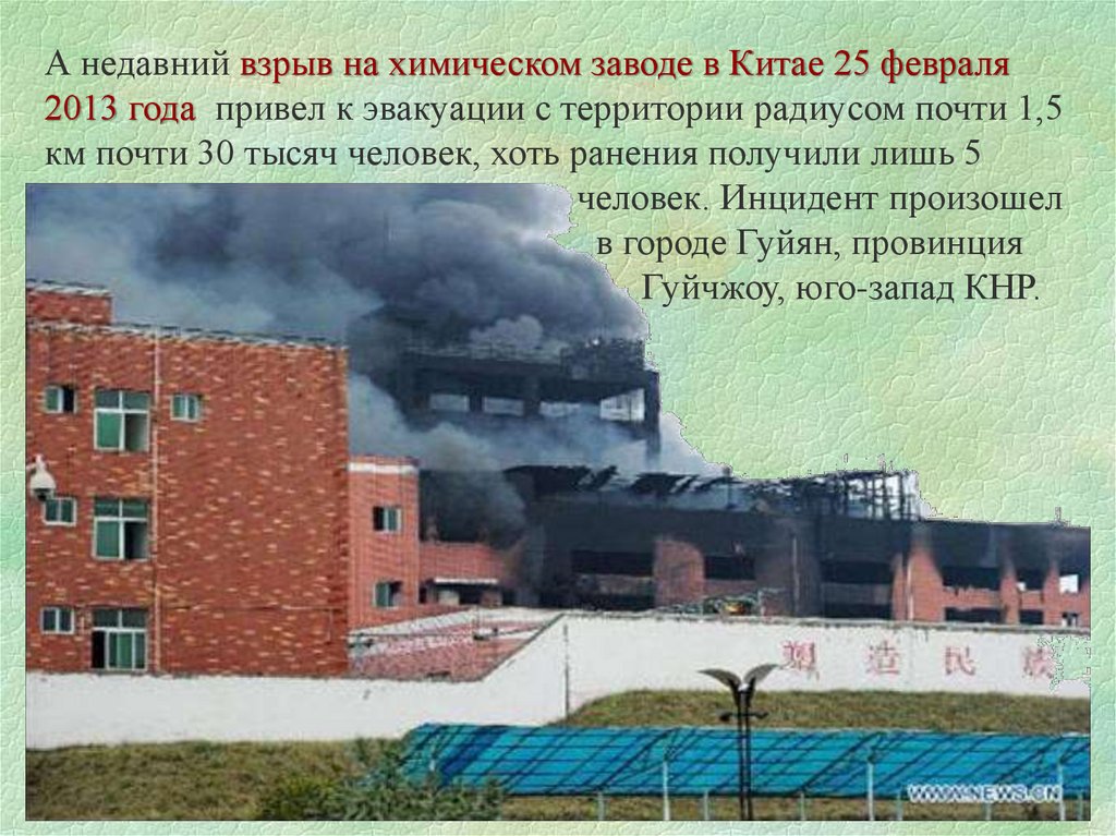 А недавний взрыв на химическом заводе в Китае 25 февраля2013 года привел к эвакуации с территории радиусом почти 1,5