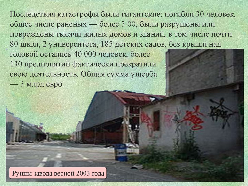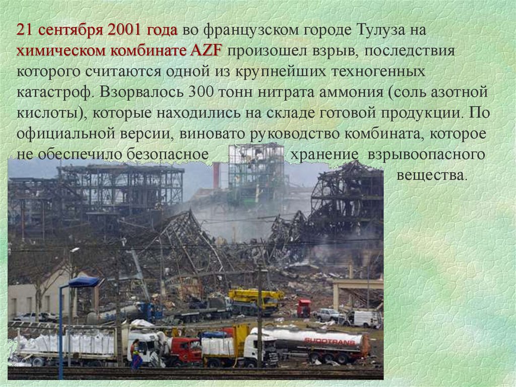 21 сентября 2001 года во французском городе Тулуза нахимическом комбинате AZF произошел взрыв, последствия