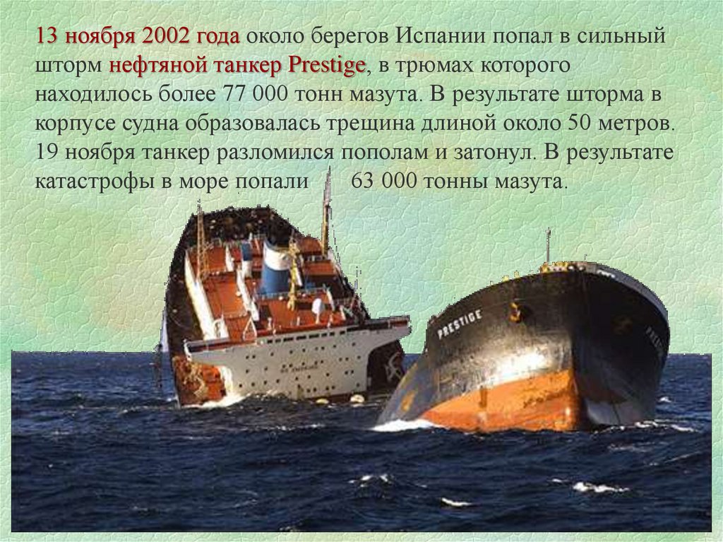 13 ноября 2002 года около берегов Испании попал в сильныйшторм нефтяной танкер Prestige, в трюмах которого