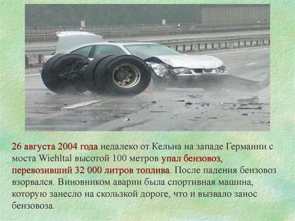 26 августа 2004 года недалеко от Кельна на западе Германии смоста Wiehltal высотой 100 метров упал бензовоз,