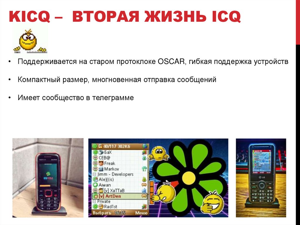KICQ – ВТОРАЯ ЖИЗНЬ ICQ• Поддерживается на старом протоклоке OSCAR, гибкая поддержка устройств