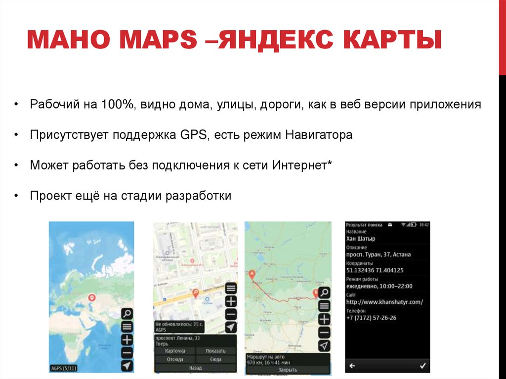 • Рабочий на 100%, видно дома, улицы, дороги, как в веб версии приложения• Присутствует поддержка GPS, есть режим Навигатора