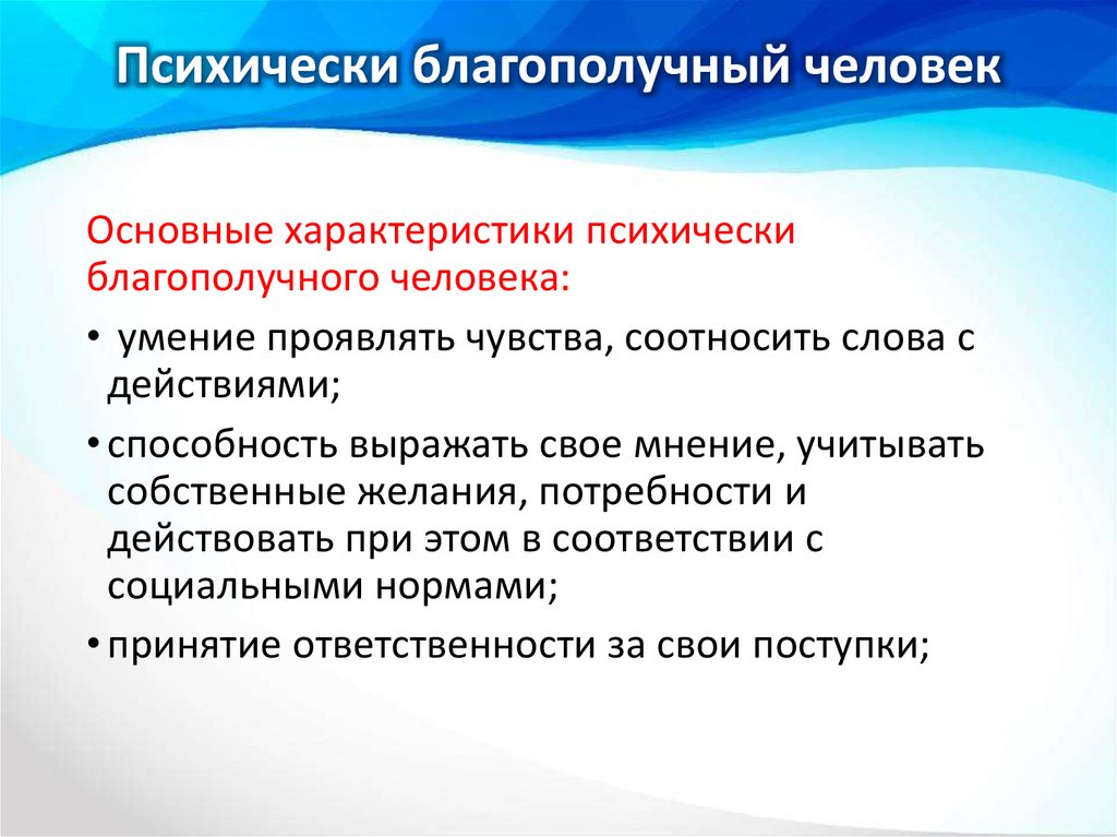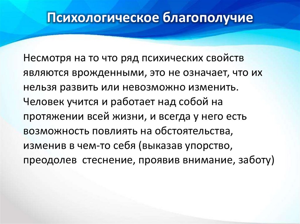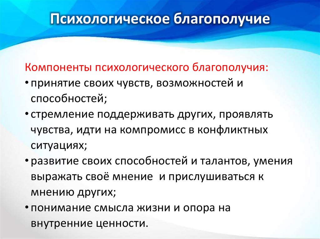 Компоненты психологического благополучия:• принятие своих чувств, возможностей и