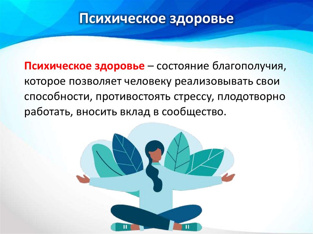 Психическое здоровье – состояние благополучия,которое позволяет человеку реализовывать свои
