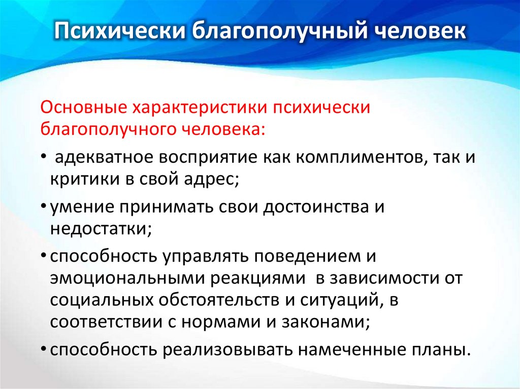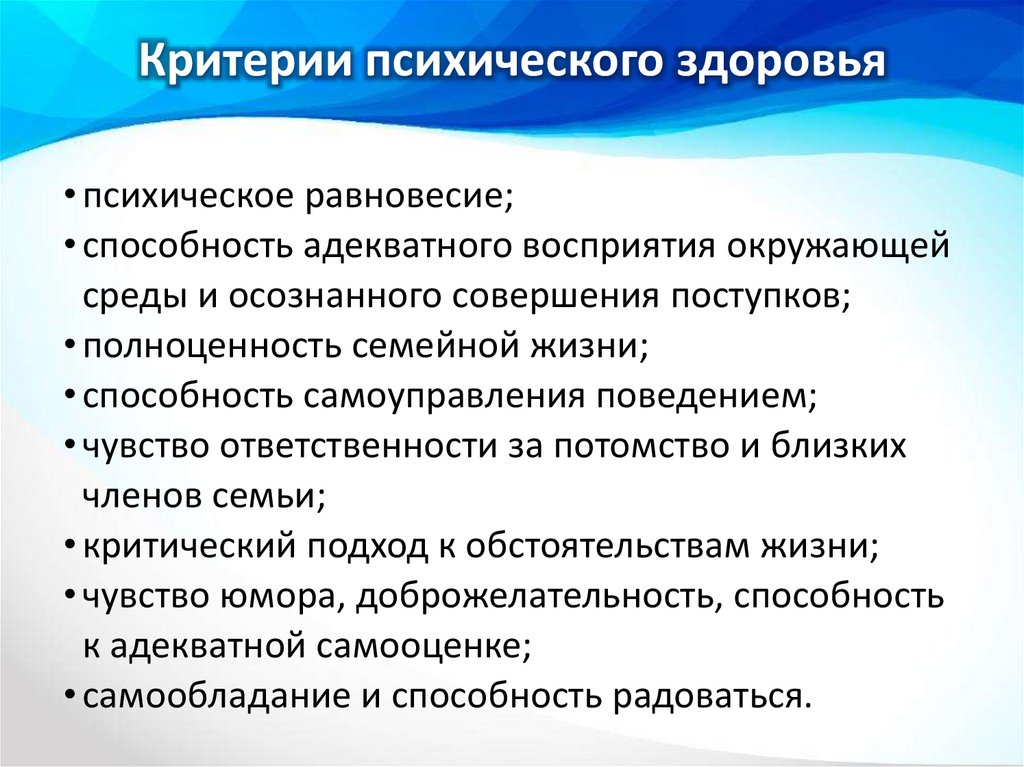 • психическое равновесие;• способность адекватного восприятия окружающей