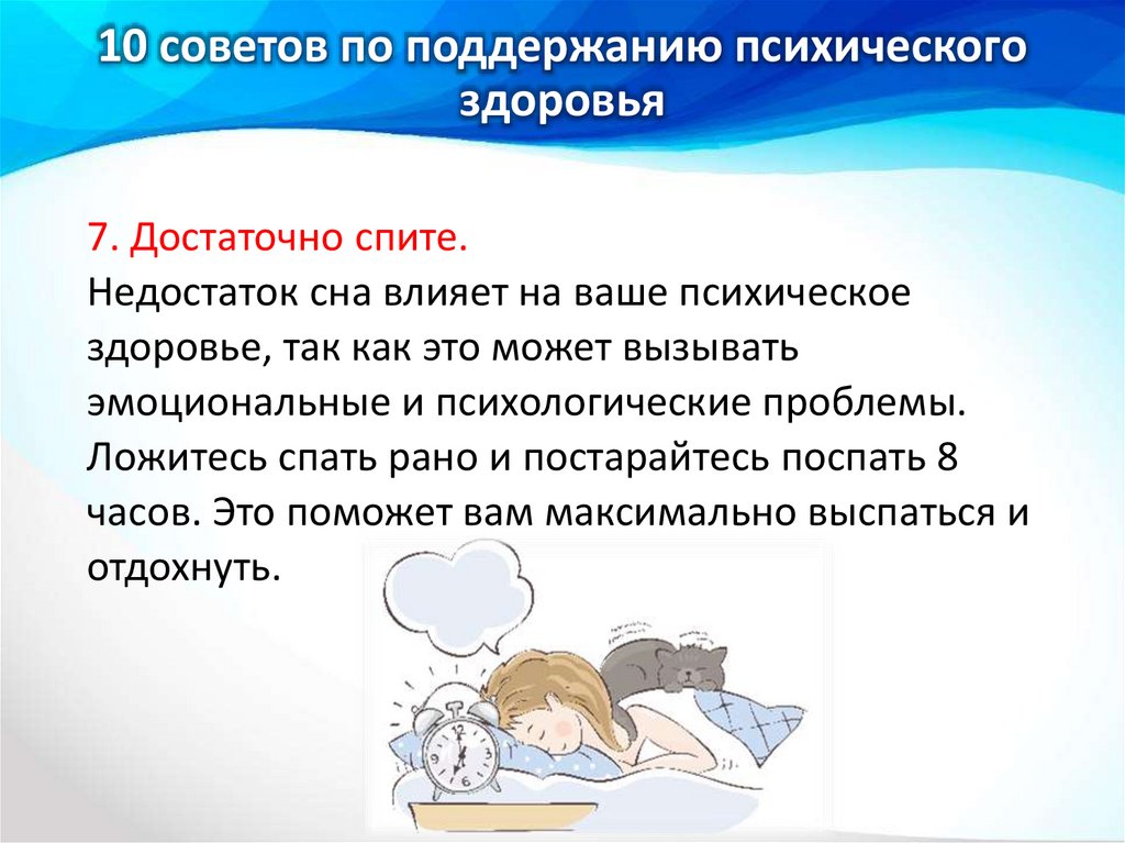 7. Достаточно спите.Недостаток сна влияет на ваше психическое