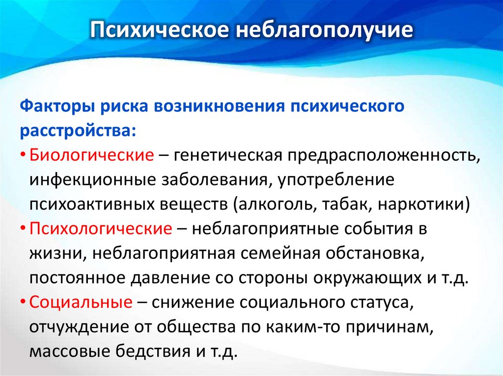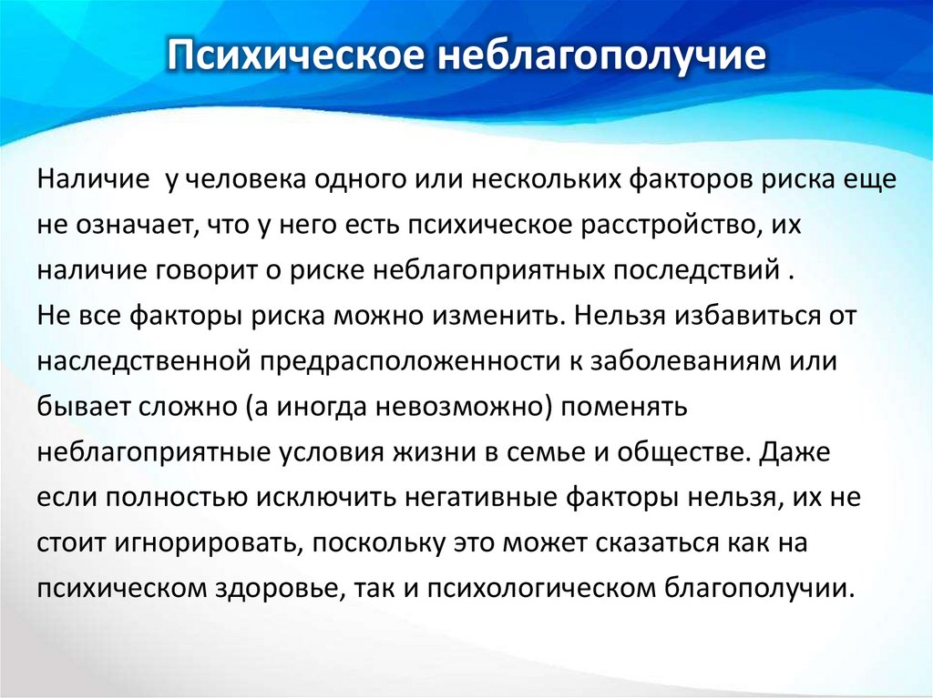 Наличие у человека одного или нескольких факторов риска ещене означает, что у него есть психическое расстройство, их