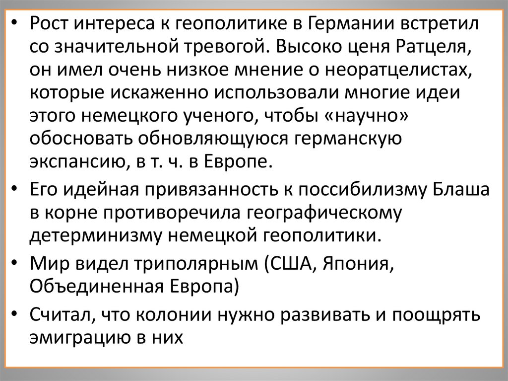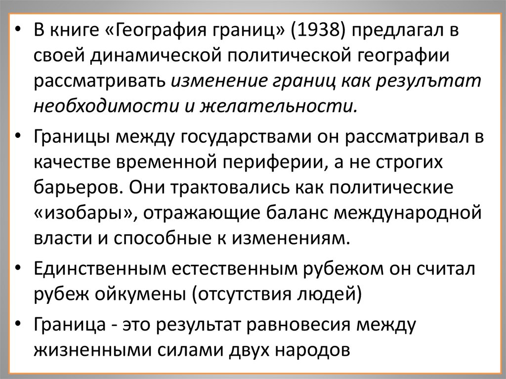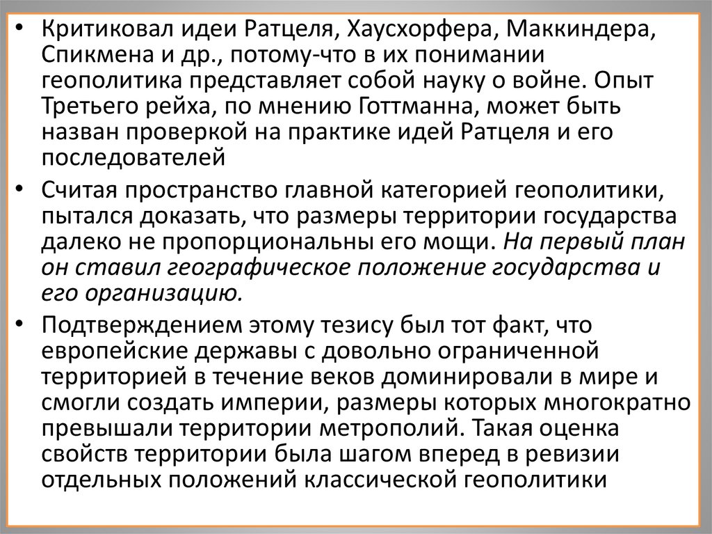 • Критиковал идеи Ратцеля, Хаусхорфера, Маккиндера,Спикмена и др., потому-что в их понимании