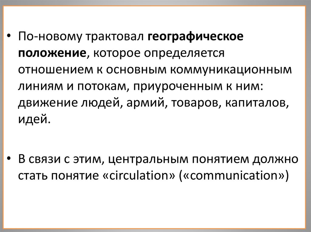 • По-новому трактовал географическоеположение, которое определяется