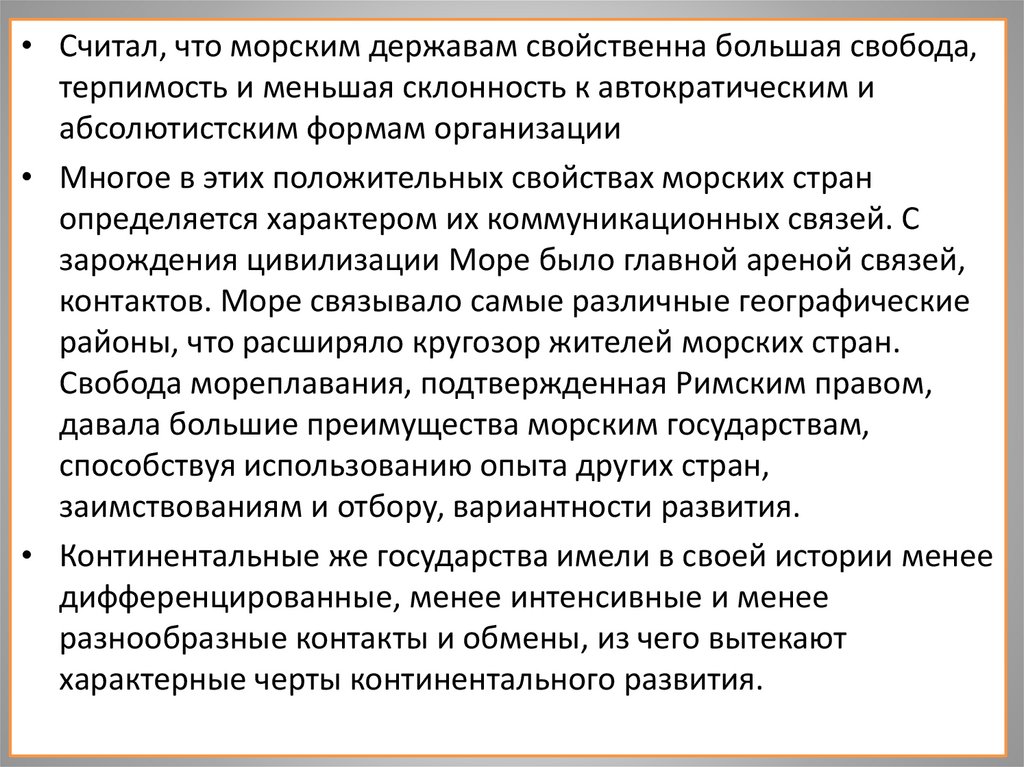 • Считал, что морским державам свойственна большая свобода,терпимость и меньшая склонность к автократическим и