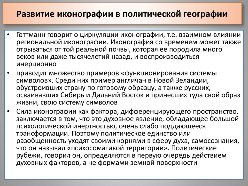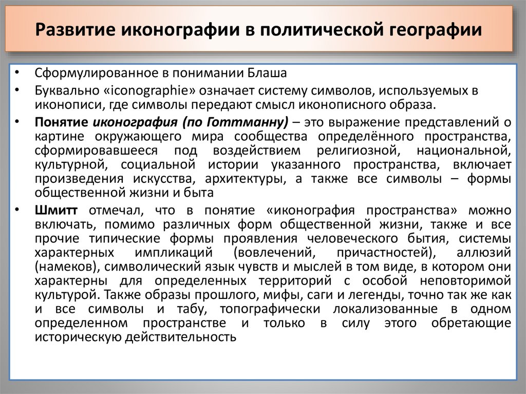• Понятие иконография (по Готтманну) – это выражение представлений о