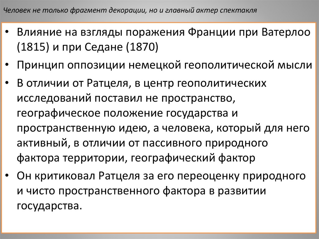 • Он критиковал Ратцеля за его переоценку природного