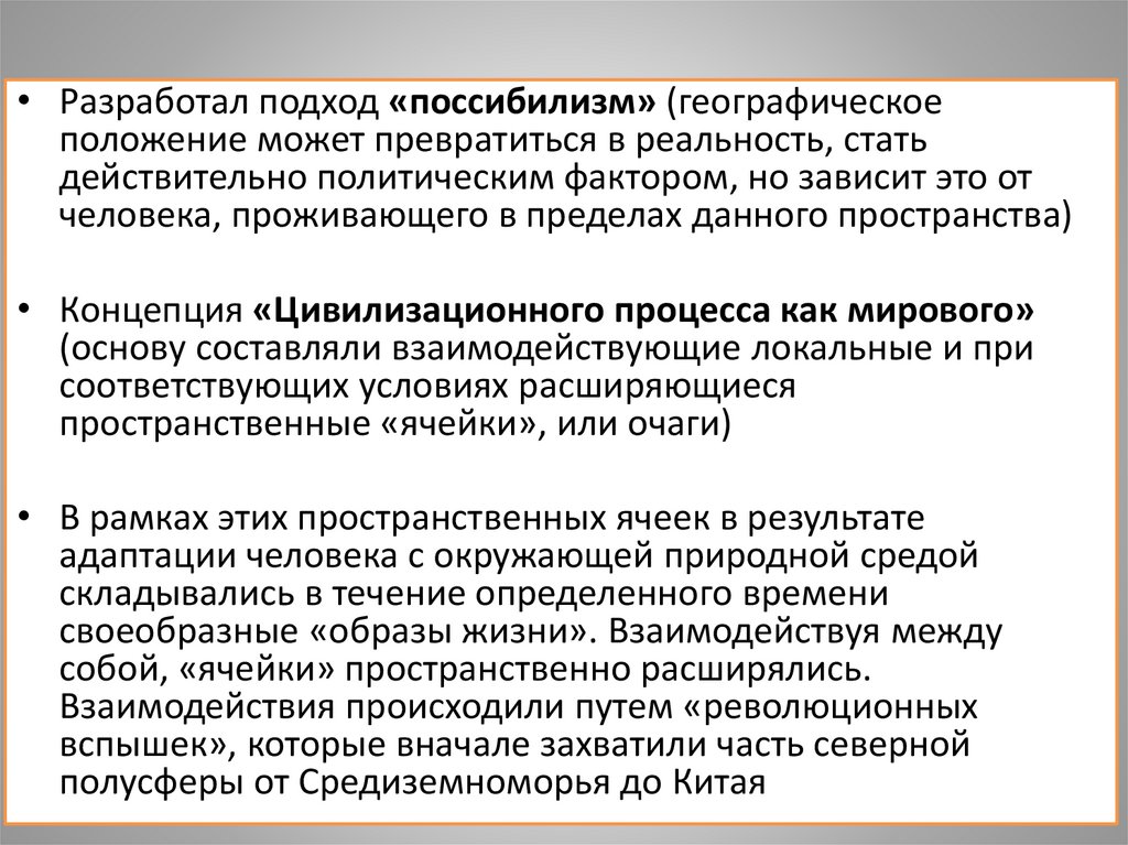 • Разработал подход «поссибилизм» (географическоеположение может превратиться в реальность, стать