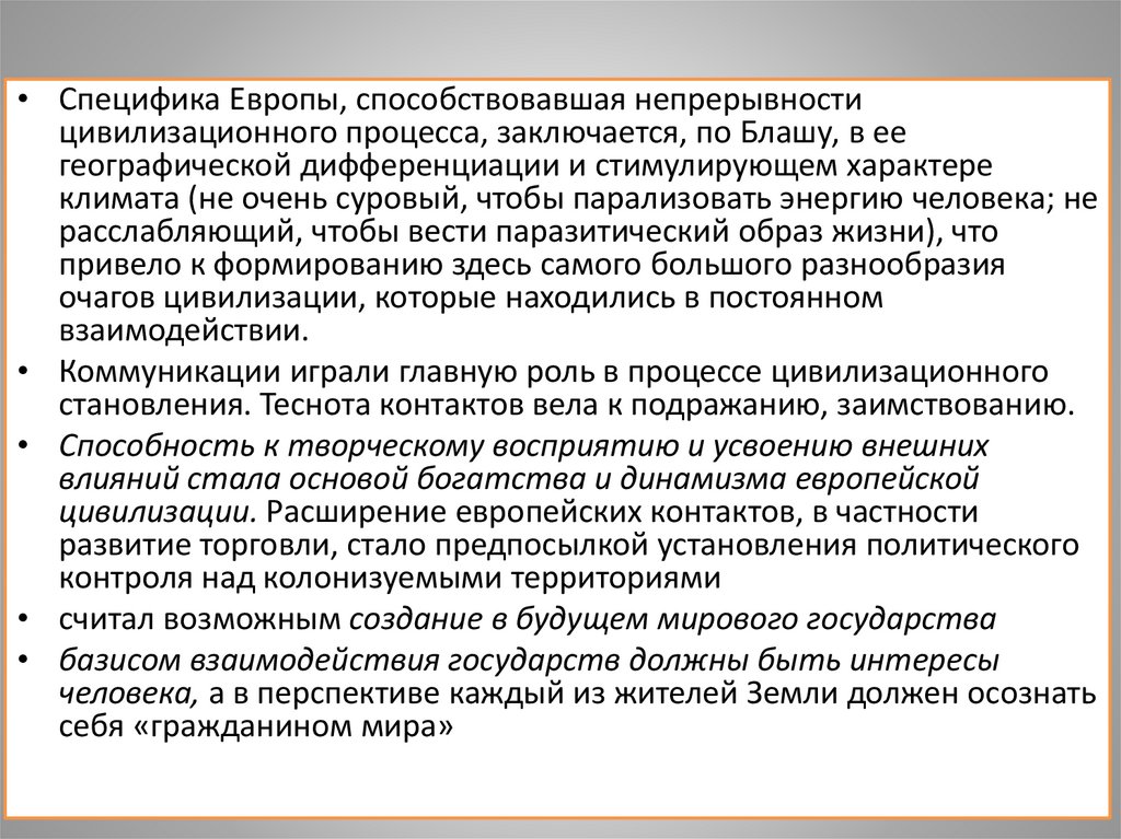 • Специфика Европы, способствовавшая непрерывностицивилизационного процесса, заключается, по Блашу, в ее