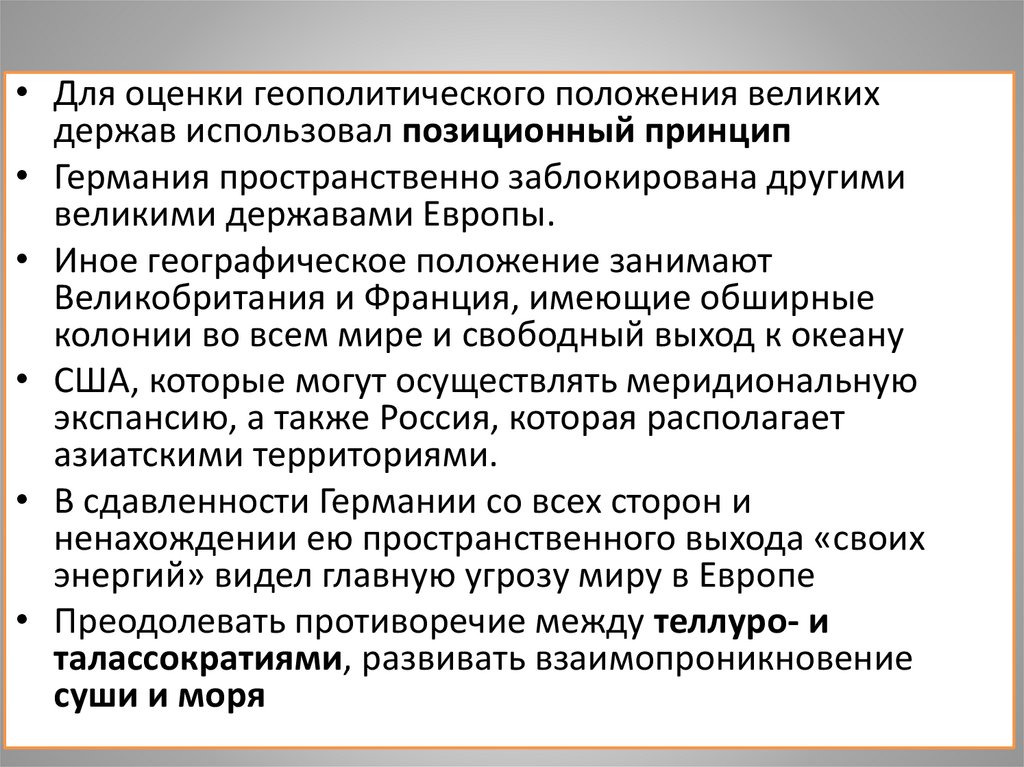 • Для оценки геополитического положения великихдержав использовал позиционный принцип