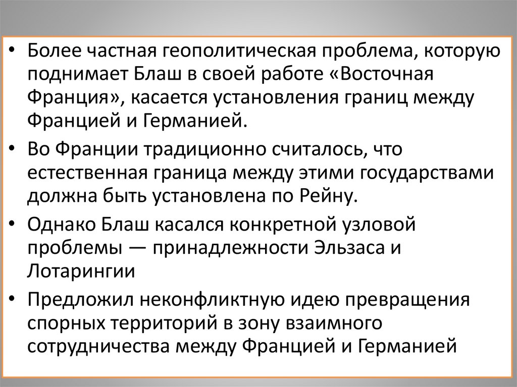 • Более частная геополитическая проблема, которуюподнимает Блаш в своей работе «Восточная