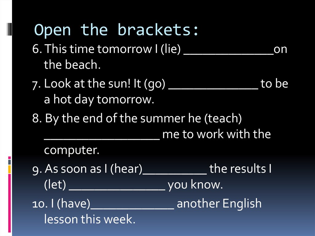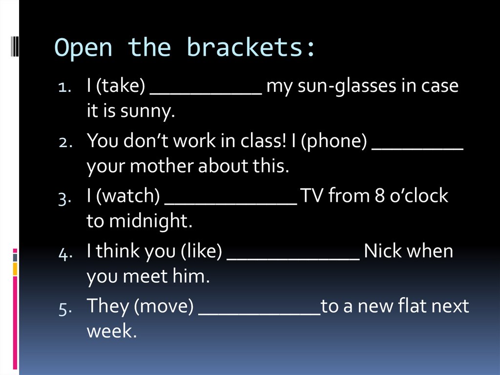 1. I (take) ___________ my sun-glasses in caseit is sunny.