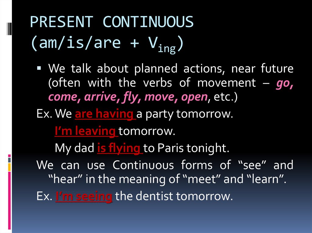 4. PRESENT CONTINUOUS (am/is/are + Ving)