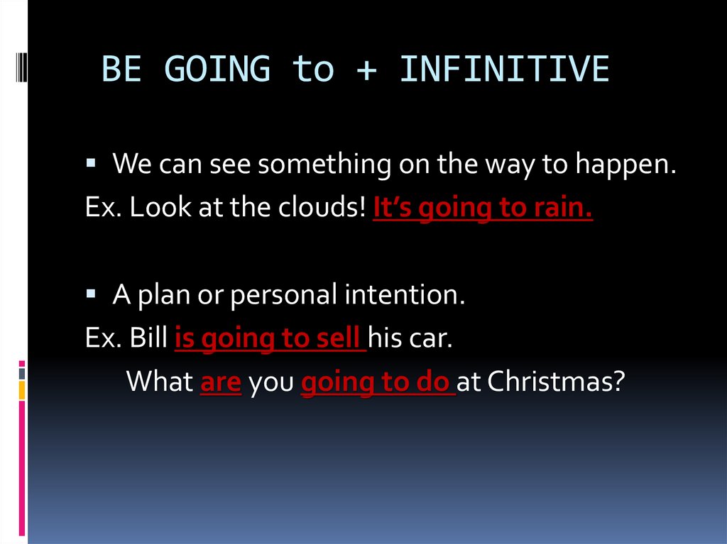We can see something on the way to happen.Ex. Look at the clouds! It’s going to rain.