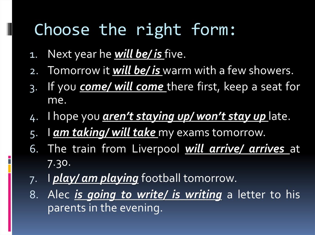 1. Next year he will be/ is five.2. Tomorrow it will be/ is warm with a few showers.