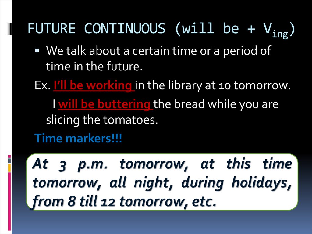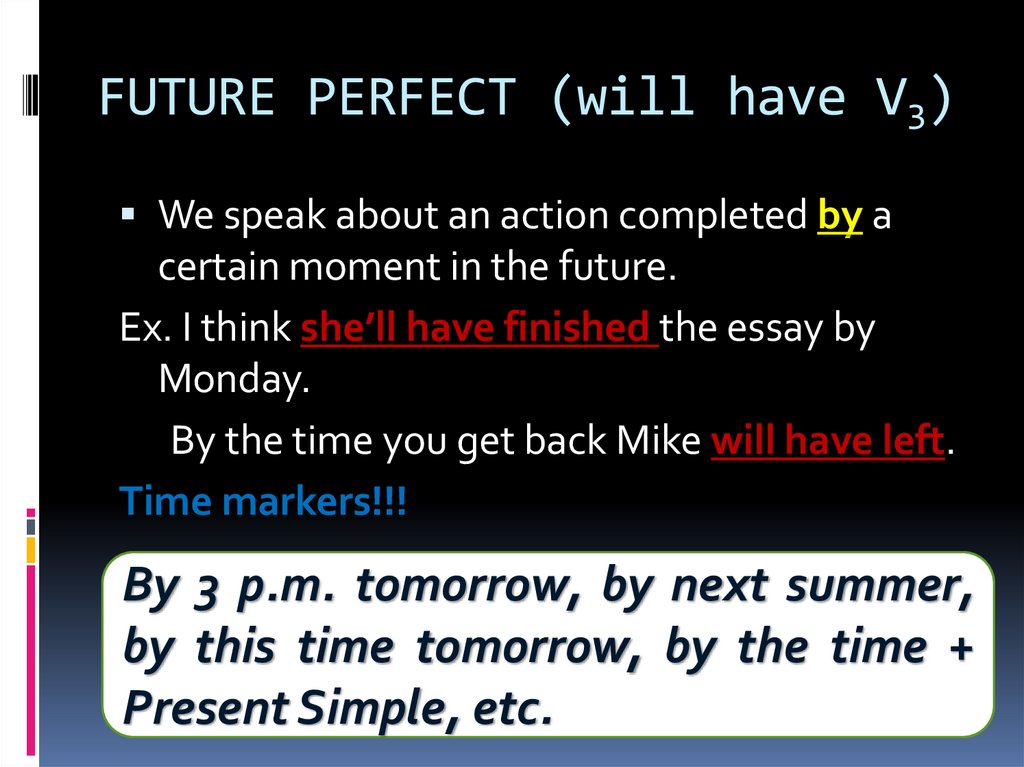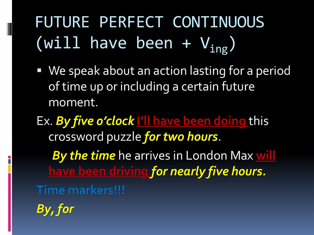 10. FUTURE PERFECT CONTINUOUS (will have been + Ving)