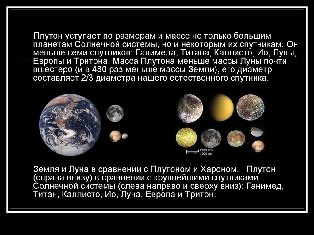 Плутон уступает по размерам и массе не только большимпланетам Солнечной системы, но и некоторым их спутникам. Он