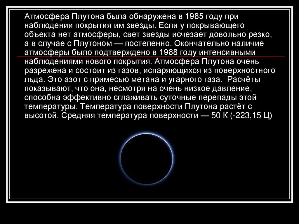 Атмосфера Плутона была обнаружена в 1985 году принаблюдении покрытия им звезды. Если у покрывающего