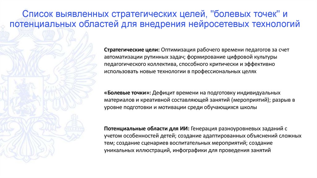 Список выявленных стратегических целей, "болевых точек" ипотенциальных областей для внедрения нейросетевых технологий
