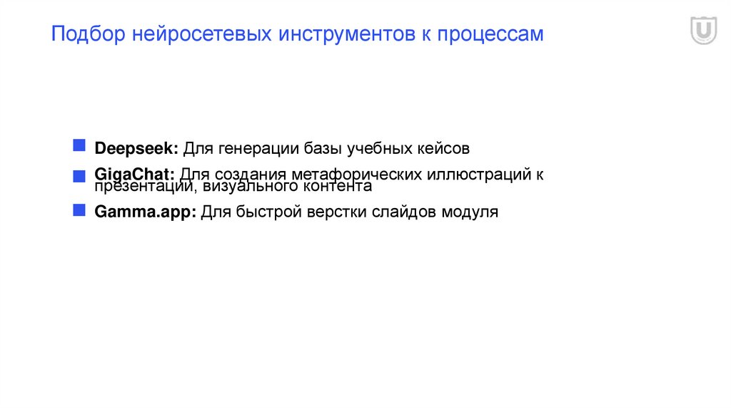 Подбор нейросетевых инструментов к процессамDeepseek: Для генерации базы учебных кейсов