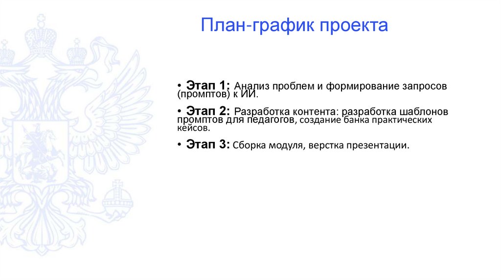 План-график проекта• Этап 1: Анализ проблем и формирование запросов