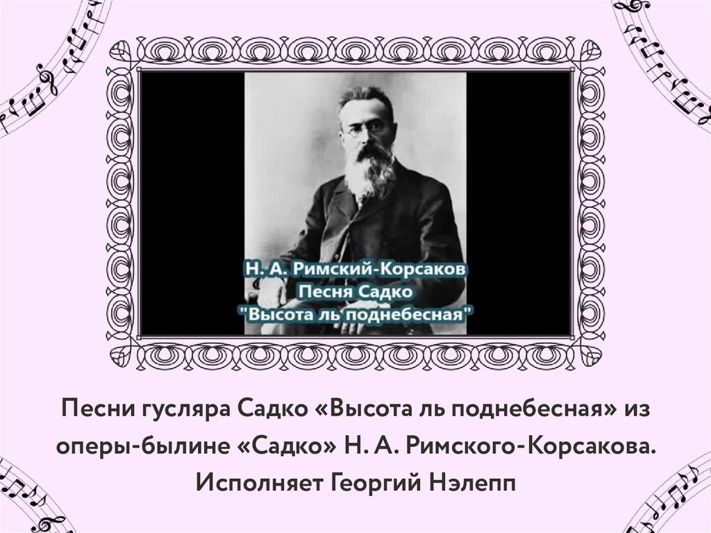 Песни гусляра Садко «Высота ль поднебесная» изоперы-былине «Садко» Н. А. Римского-Корсакова.