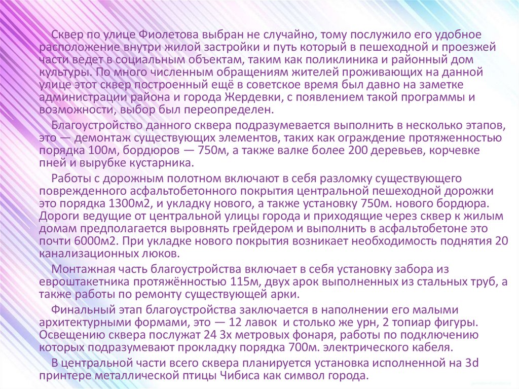Сквер по улице Фиолетова выбран не случайно, тому послужило его удобноерасположение внутри жилой застройки и путь который в пешеходной и проезжей
