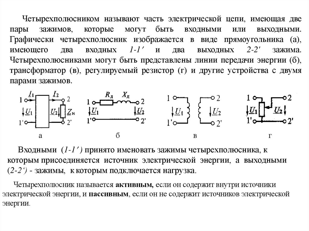2. Четырехполюсником называют часть электрической цепи, имеющая две пары зажимов, которые могут быть входными или выходными.