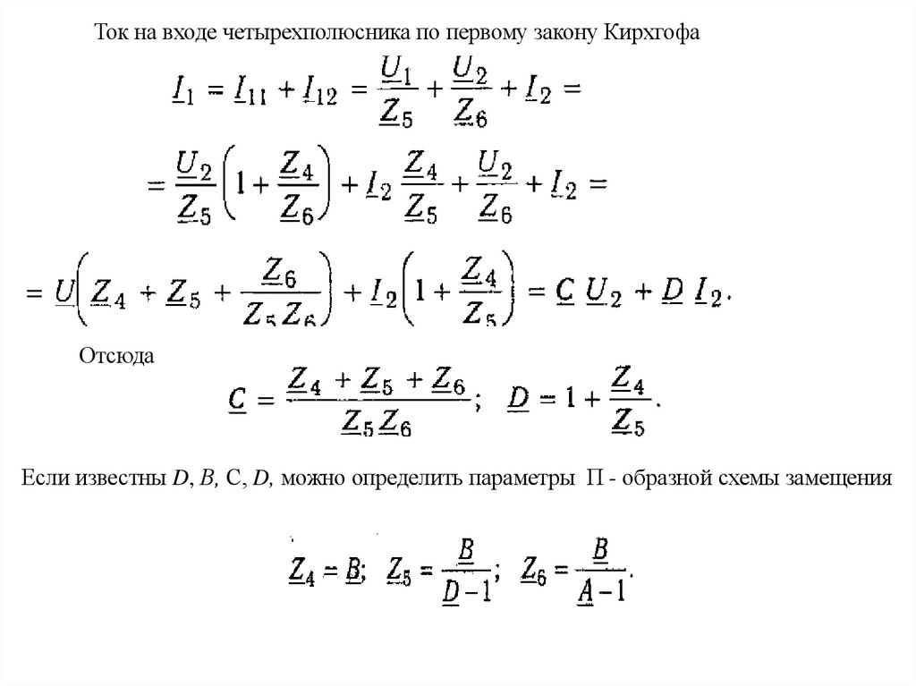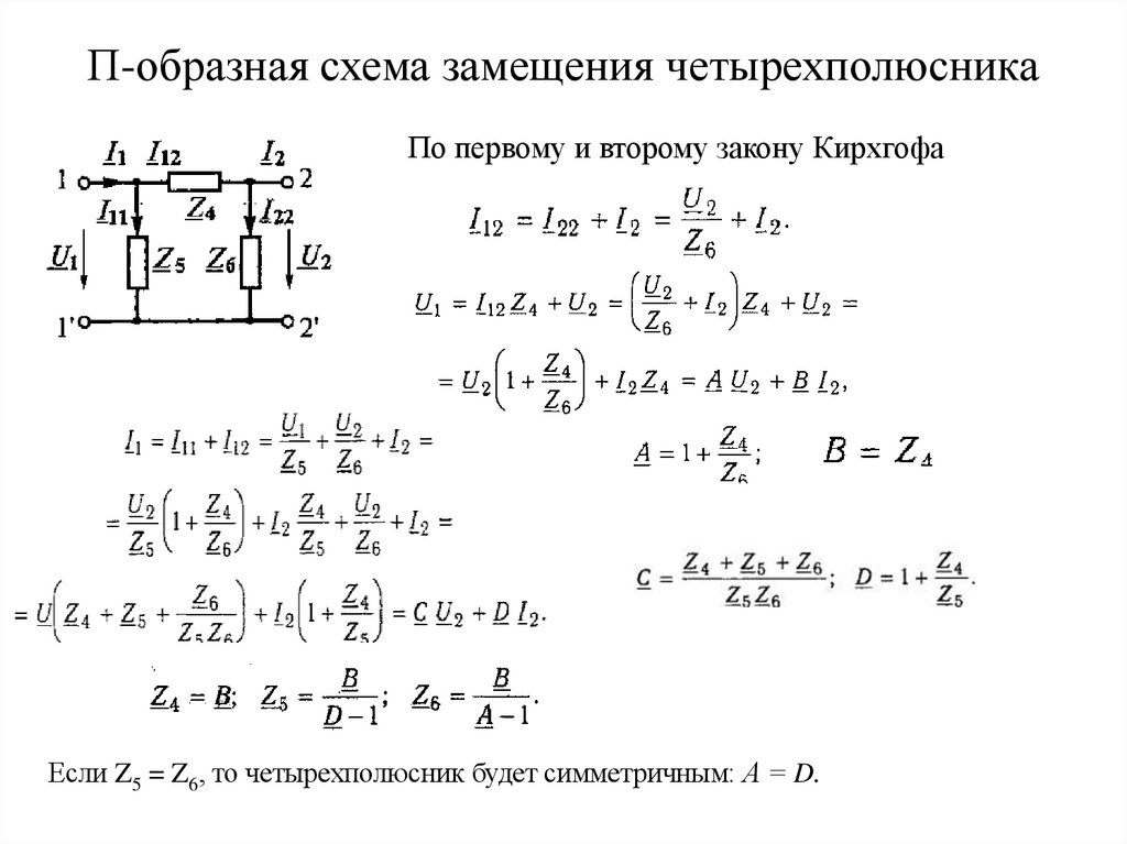 По первому и второму закону КирхгофаЕсли Z5 = Z6, то четырехполюсник будет симметричным: А = D.