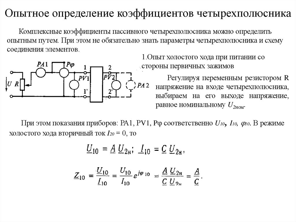 Комплексные коэффициенты пассивного четырехполюсника можно определитьопытным путем. При этом не обязательно знать параметры четырехполюсника и схему