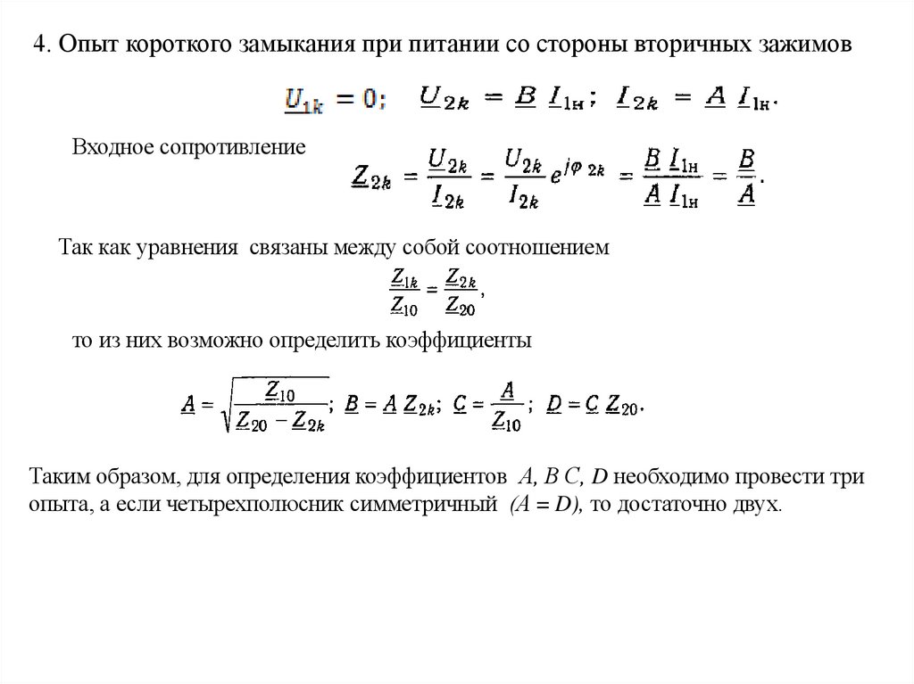опыта, а если четырехполюсник симметричный (А = D), то достаточно двух.
